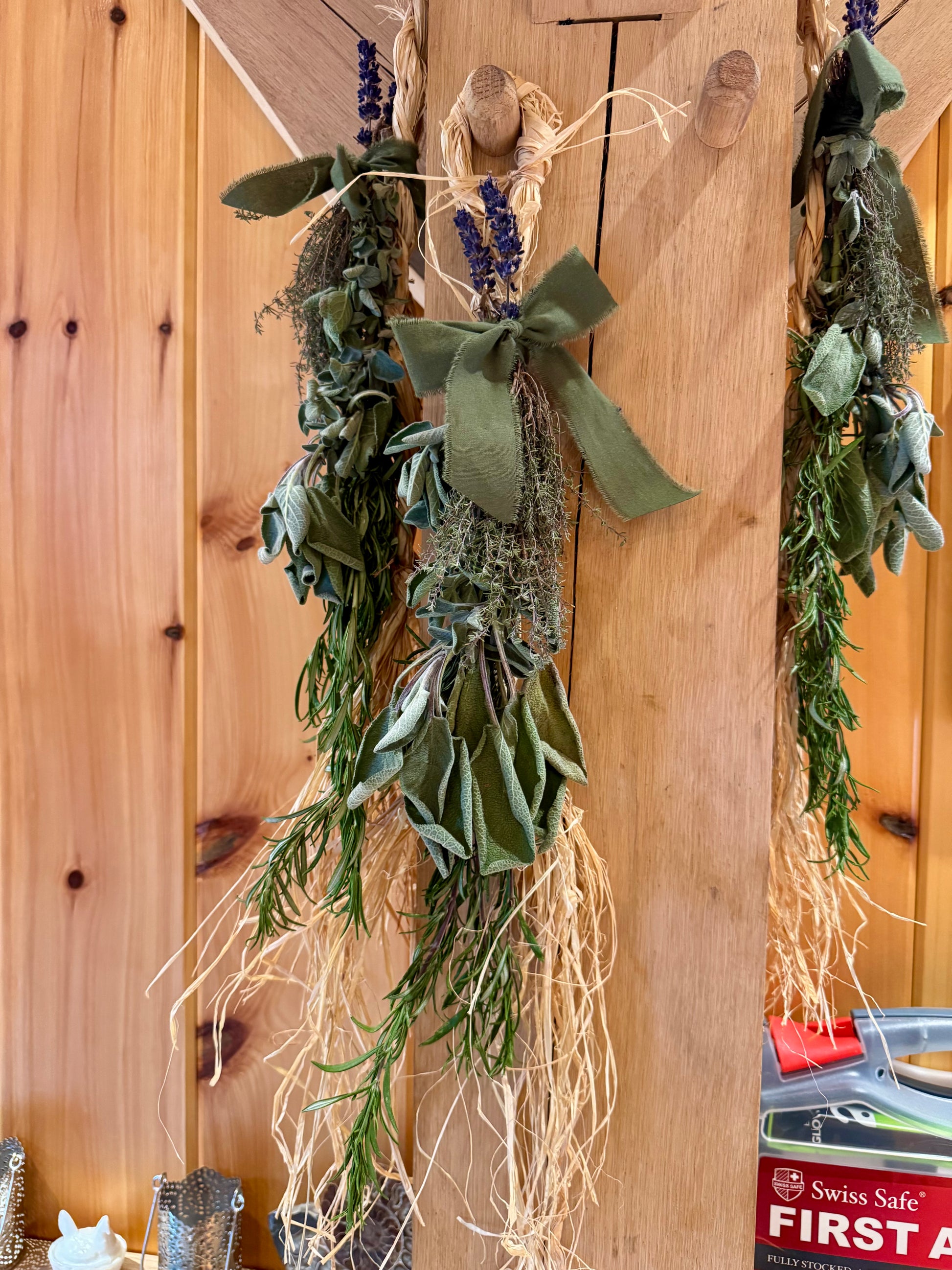 This item is for ONE BRAIDED RAFFIA HERB SWAG. A hand-tied bundle of rosemary, thyme, sage, and culinary lavender braided into natural raffia. Fresh, fragrant, and rustic. Hang it in the kitchen to dry for cooking, or display it as a natural accent. Herbs dry beautifully in place and can be used straight from the swag. Each one is slightly unique.