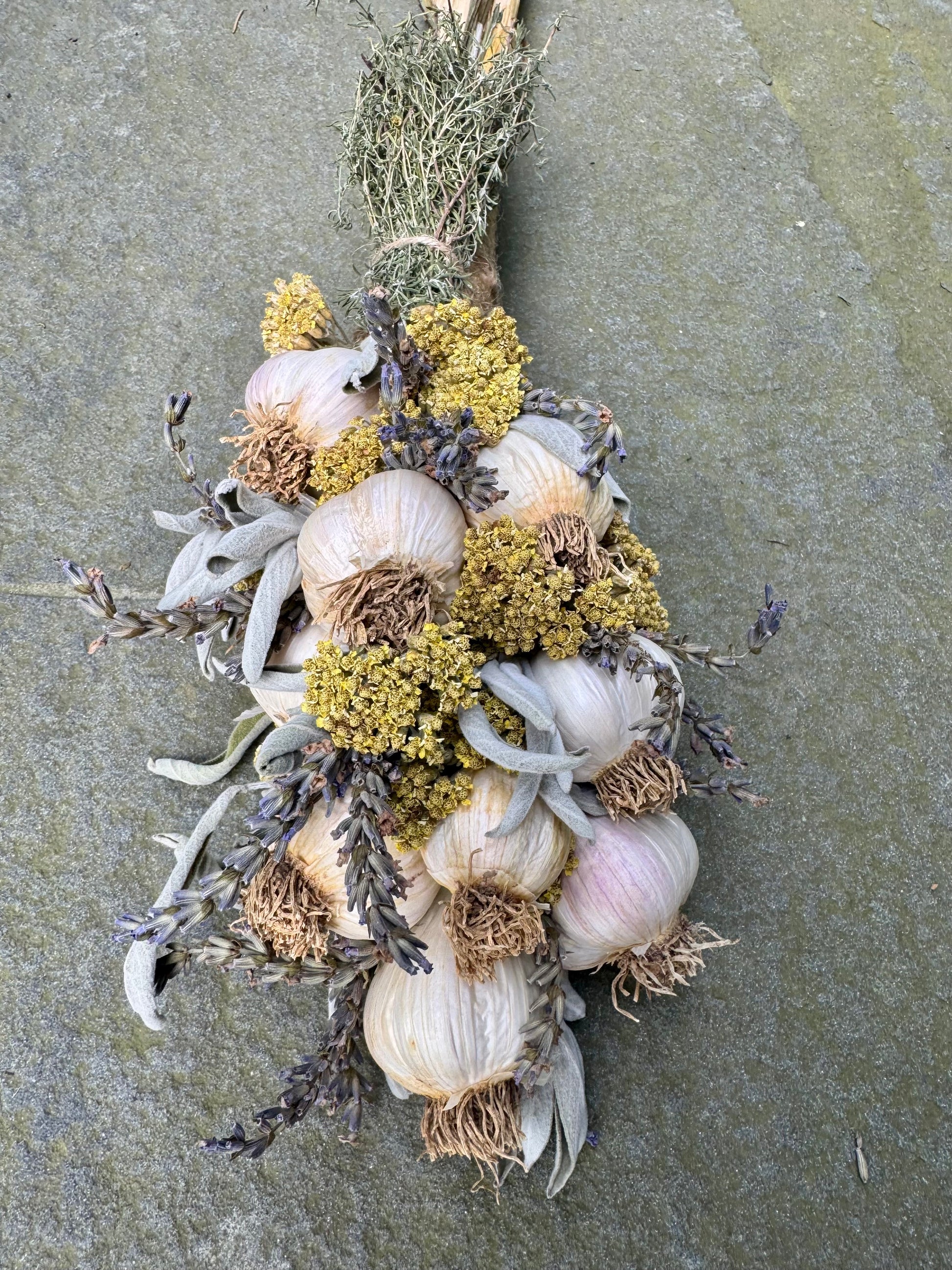 This item is for ONE FLORAL GARLIC BRAID. Our delicious Montana Giant Garlic has been braided with fragrant Lavender and Yarrow for a beautiful display that is to be used in the kitchen for all of your dishes calling for garlic.